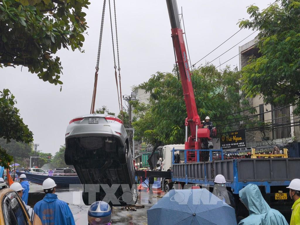 Lực lượng chức năng cẩu xe ô tô từ dưới hố lên. Ảnh: Quốc Dũng - TTXVN