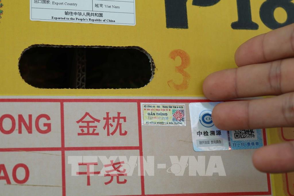 Trên mỗi thùng sầu riêng quả tươi có dán tem QR code để truy xuất nguồn gốc đóng do Trung tâm Tem và Vật liệu chống giả, Bộ Công an cung cấp. Ảnh: Quang Duy - TTXVN