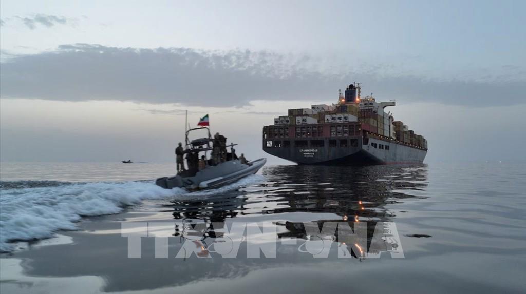 Lực lượng Vệ binh Cách mạng Hồi giáo Iran bắt giữ tàu container treo cờ Liberia Epaminondas trên eo biển Hormuz với cáo buộc có liên hệ với quân đội Mỹ, ngày 24/4/2026. Ảnh: Reuters/TTXVN